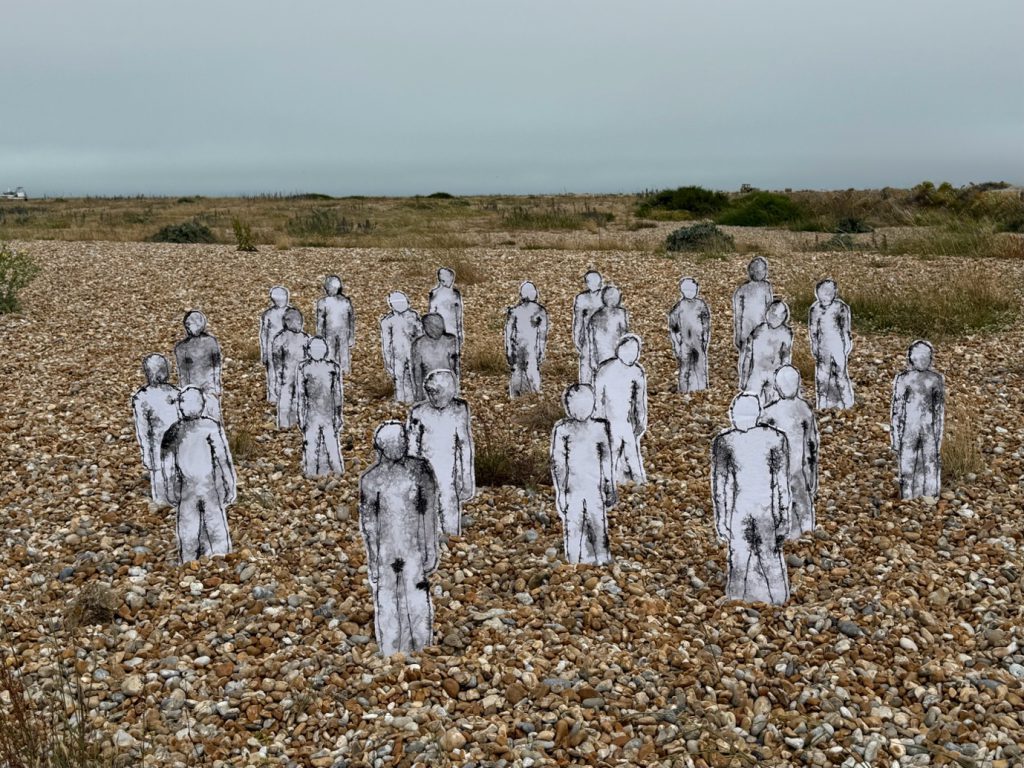 I have been developing a body of work using figure drawing on wet paper where some of the control over the final image is given over to the materials. Initially the figures were collaged onto one of my favourite surfaces to work on, paper shopping bags. I developed the work firstly with a banner and then made a group of free standing figures to use to ‘populate’ Dungeness.